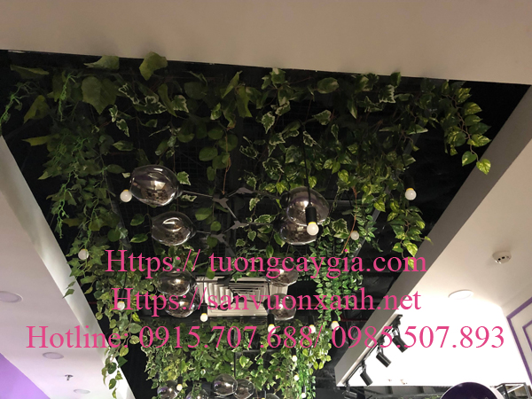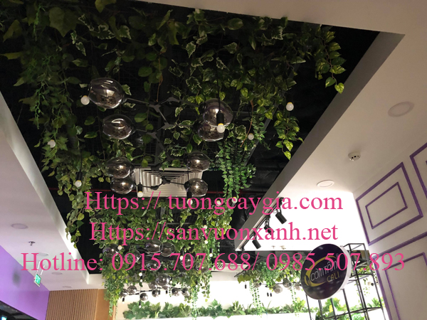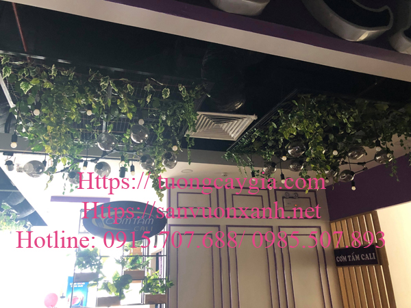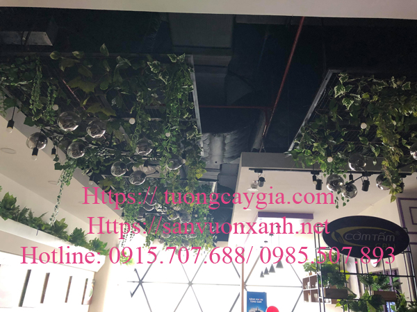 Trần nhà phủ cây xanh để che bớt điểm khiếm khuyết các ống dây điện, ống bảo ôn,.. sẽ phần nào làm tăng thêm vẻ đẹp cho không gian nhà hàng. Hãy cùng nhìn lại công trình chúng tôi vừa hoàn thiện tại nhà hàng Cơm tấm CaLy tại tầng 5 siêu thị GiGa Mall Thủ Đức - một siêu thị hiện đại, sang trọng, đẳng cấp