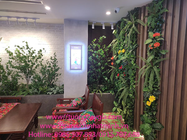 Chúng tôi chuyên cung cấp và thi công vách tường cây, vách tường cỏ giả, vườn đứng, vườn treo bằng lá, hoa, cây giả lụa với chất liệu cao cấp, độ chống bụi bẩn cao. Vườn đứng cây lá giả là vườn sử dụng nhiều loại lá cây khác nhau kết hợp thành một bức tranh sinh động nhiều màu sắc, vừa mang tính thẩm mỹ, tự nhiên và tràn đầy sự tươi mát cho khung cảnh nội - ngoại thất. Với ưu điểm của cây giả giúp bạn không lo mất công chăm sóc và dọn dẹp mà vẫn giữ được độ tự nhiên nhất ( giống thật tới 99%) Trang trí nội thất và ngoại thất cho các: - Hộ gia đình. - Văn phòng, cơ quan. - Quán bar, coffee, cửa hàng, show room,... - Trung tâm thương mại, tiệc cưới, sự kiện,…. Với đa dạng mẫu mã và giá thành tốt nhất. - Chúng tôi có chính sách bảo hành trọn đời sản phẩm, miễn phí công thiết kế, lắp đặt, vận chuyển.