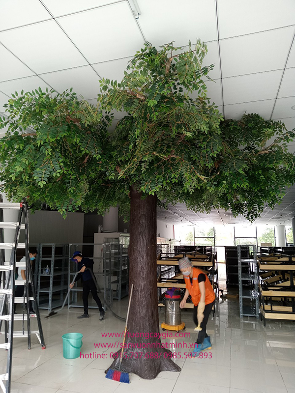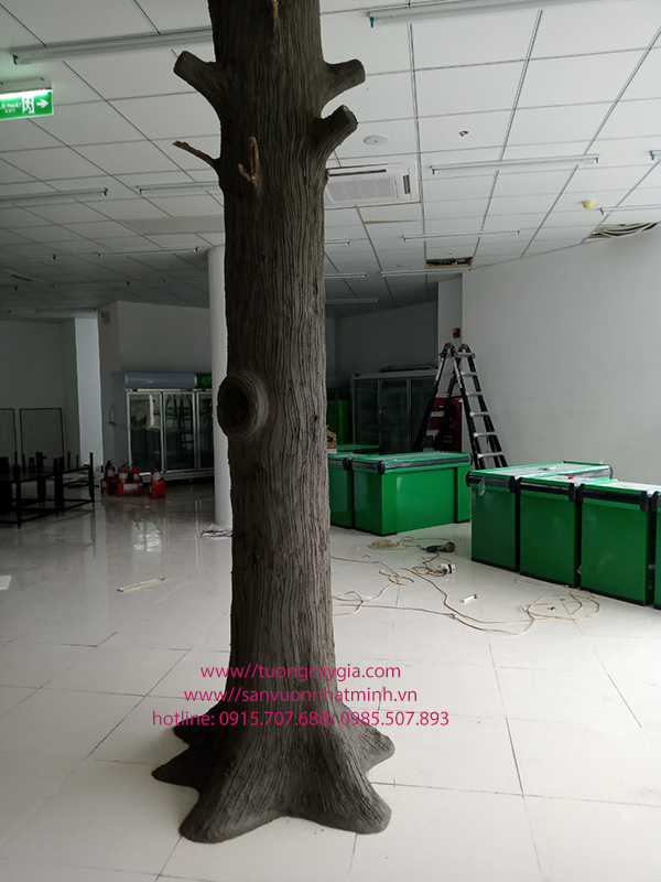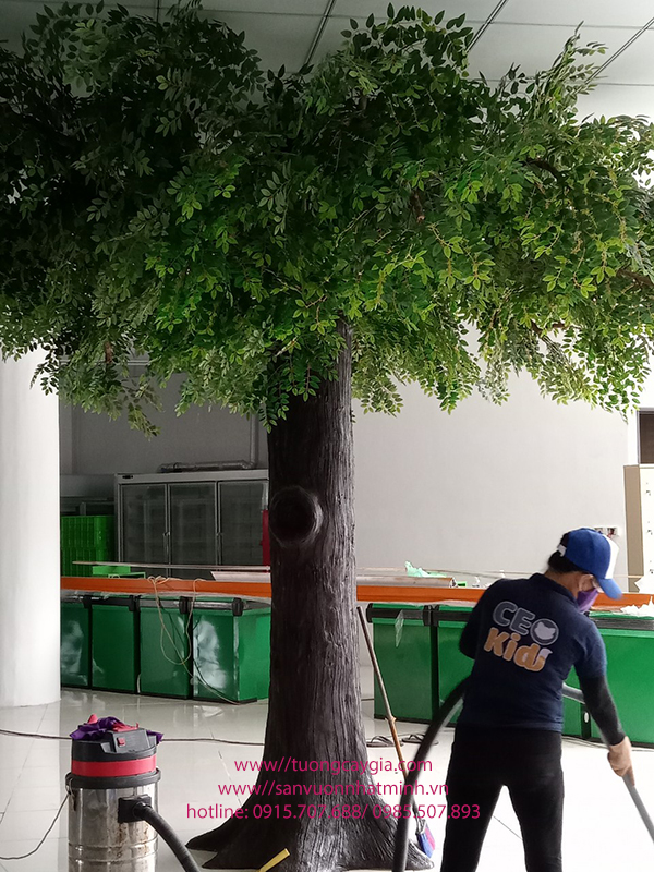 Dưới bàn tay khéo léo và sự tinh tế, chúng tôi đã đắp tạo thân vỏ cây bằng nhiều lớp xi măng xù xì, tạo cành đua ra từ thân sao cho giống dáng cây thật nhất. Sau đó đợi xi măng khô chúng tôi tạo hình dáng thân vỏ, sơn nhiều lớp màu, phủ bóng và công đoạn cuối là khoan cành gắn lá si xanh lên hoàn thiện cho cây.