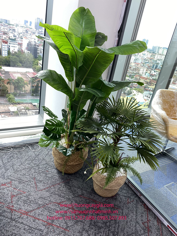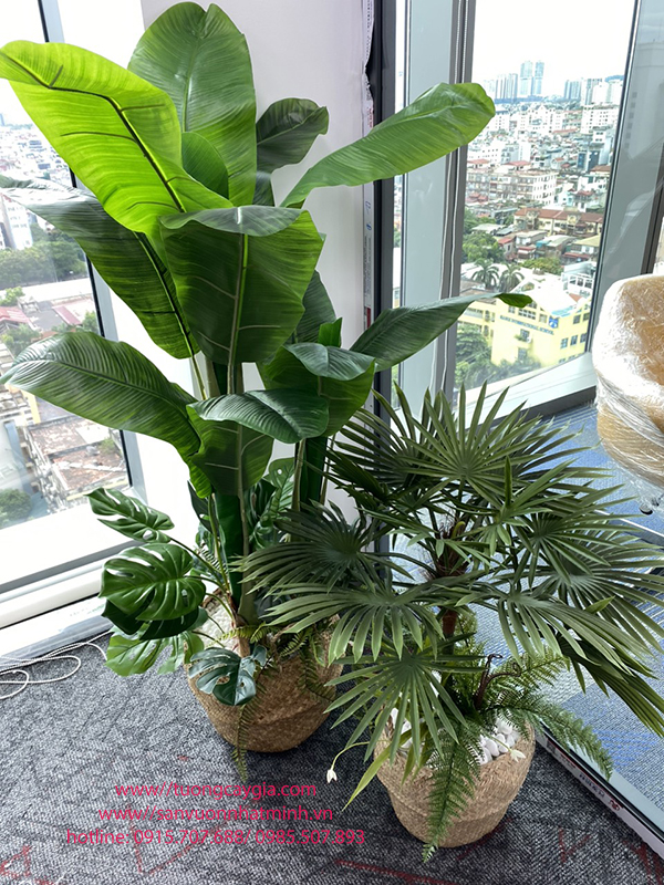 Giỏ chuối kết hợp với chậu cây lá cọ xanh tươi