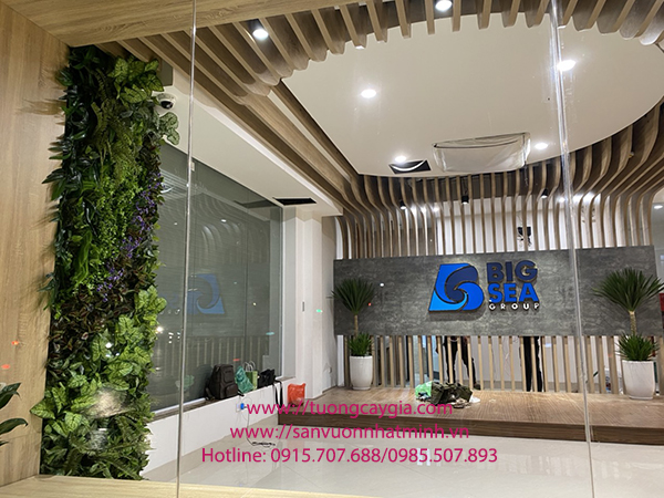 Vách tường hoa lá cây xanh hỗn hợp được sắp đặt một cách tính tế đầy tính thẩm mỹ tại tập đoàn Big sea group - chuyên đầu tư, tư vấn bất động sản lớn nhất Hà Nội