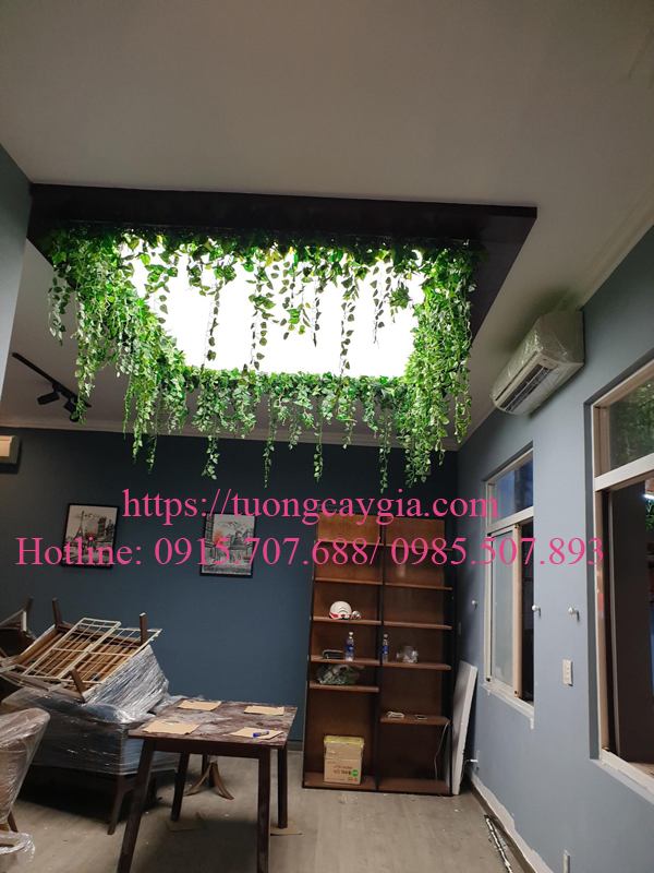 Dây leo rủ vạn niên thanh tại đèn xuyên sáng nhà hàng cà phê Q4