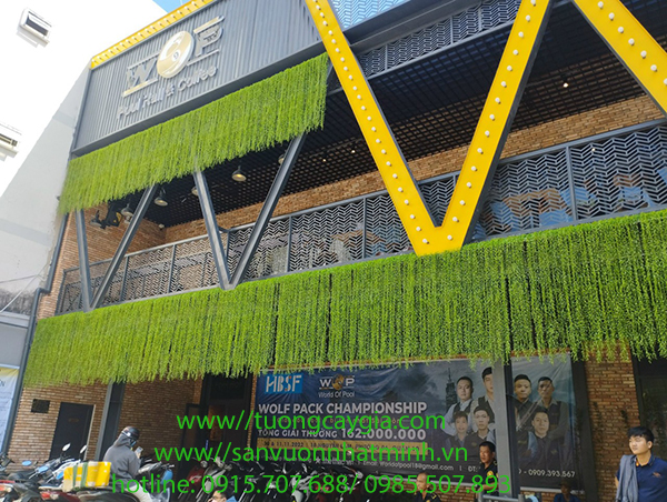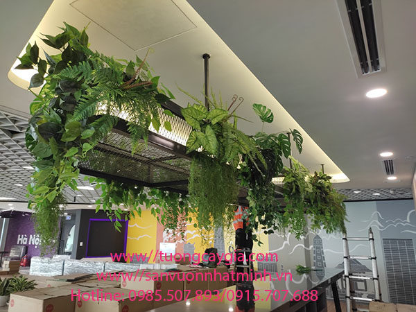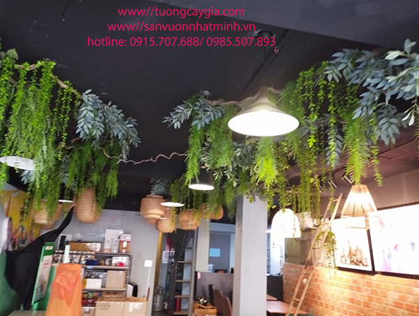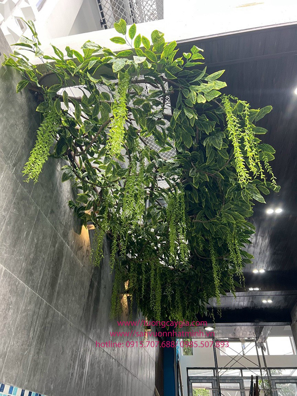 Dây leo giả rủ xuống từ khung gỗ hoặc lưới mắt cáo để tạo mảng xanh.
