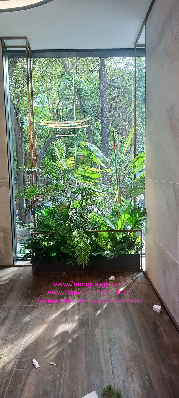 Bục cây dừa , thiên điểu có hoa, trầu bà lá sẻ đặt ngay sát vách kính mặt sảnh shomroom