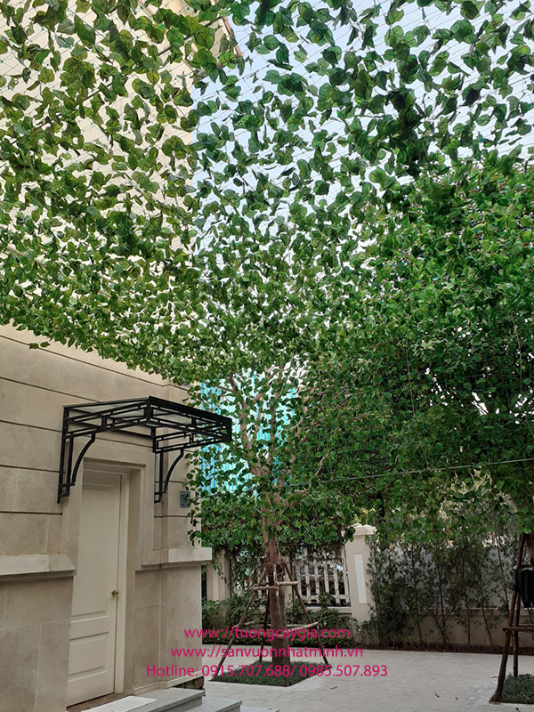 Gia chủ đã trồng cây thật xung quanh sân vườn rộng lớn nhưng cây chưa vươn rộng bò leo nên tạm thời gắn dây nho giả lên cho che bớt nắng