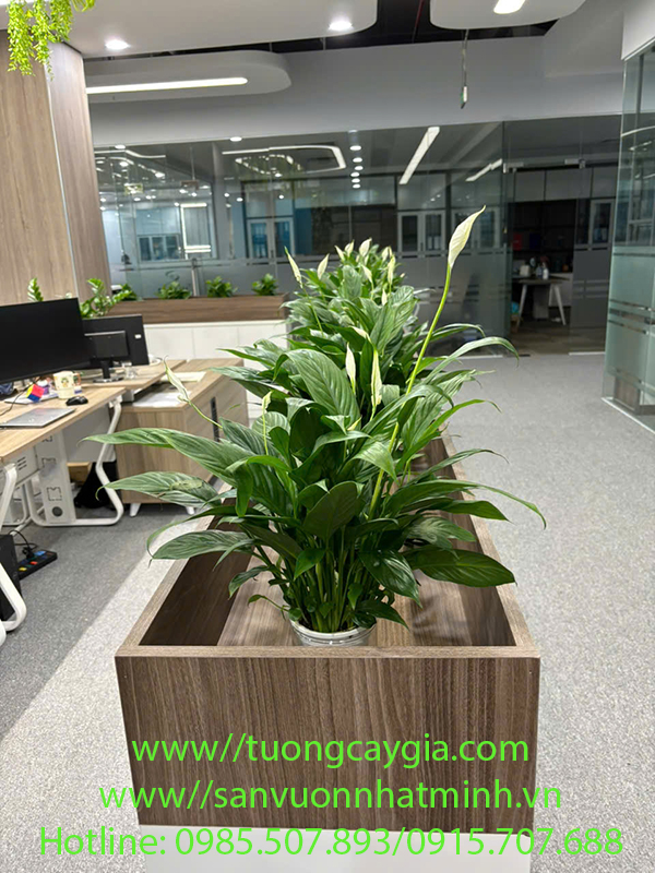 Bục cây đặt các chậu Lan Ý xanh mướt
