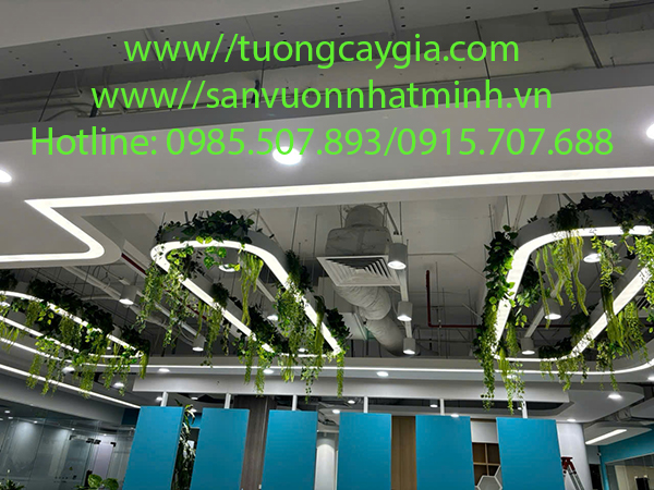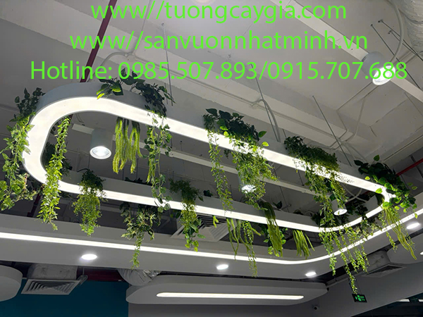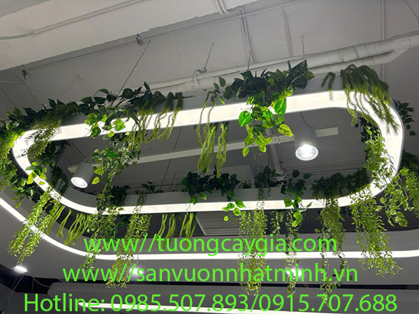 Dây leo rủ xanh từ máng đèn led từ trần rủ xuống, phía dưới là các bục cây xanh tự nhiên: Lan Ý, Vạn niên thanh,...