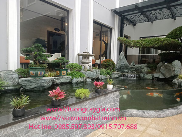 Nhật Minh là đơn vị chuyên nhận thi công tiểu cảnh, sân vườn, hồ cá koi,... với nhiều hình thù dáng bể khác nhau như hình lục, hình chữ nhật, hình cong uốn lượn, hình elip,... mỗi bể tùy vào khuôn viên của gia chủ để tư vấn làm diện tích phù hợp với không gian đã có. Dưới đây là sảnh khách sạn Vườn Thủ đô số 4 Hoàng Ngọc Phách, phường Láng Hạ, quận Đống Đa, Hà Nội vừa được chúng tôi hoàn thành: