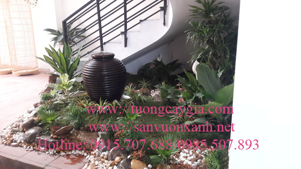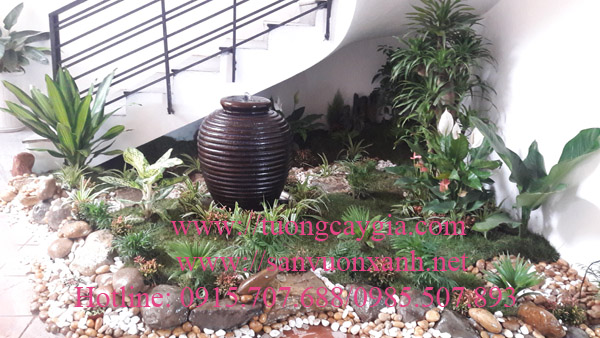 Tiểu cảnh gầm cầu thang thiết kế lu nước, trang trí cây xung quanh rất bắt mắt