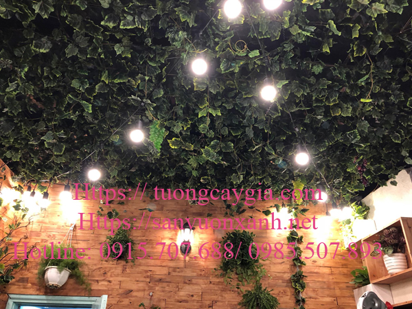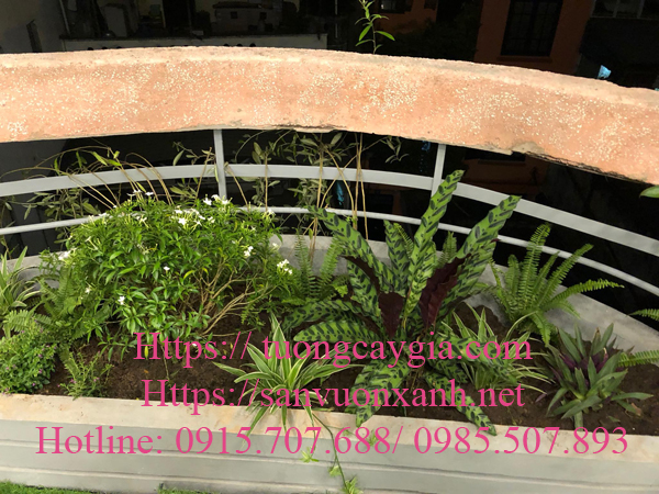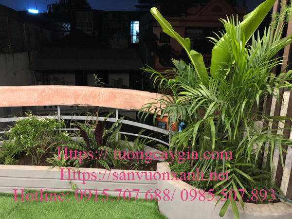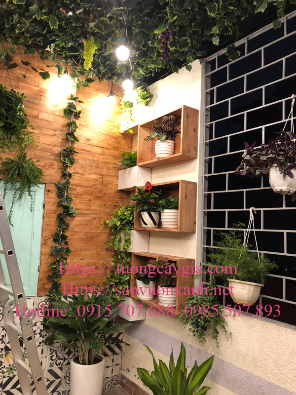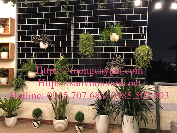 Tường cây giả Nhật Minh đã phối kết hợp phía trên mái kính trang trí dây nho rủ còn toàn hai bên hông và mặt trước căn nhà được trồng các loại cây dễ chăm sóc như: mai hoàng yến, lưỡi hổ, chuối rừng, đuôi công, cẩm tú mai, bạch chỉ, mai chiếu thủy, cúc tần ấn độ,..