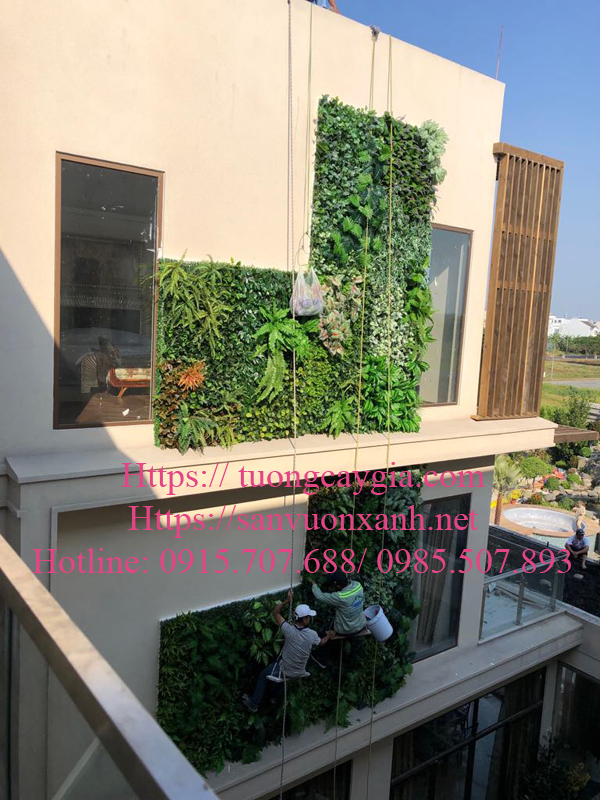 Những mảng cây bám tường được gắn vít chắc chắn, keo dính cây cẩn thận tránh mưa gió rơi rụng lá