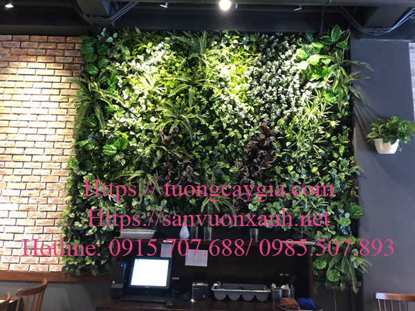 Vách tường hoa lá xanh tươi tại quầy thu ngân nhà hàng Cơm gà Hải Nam