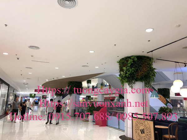 Tầng 1 toàn bộ đầu cột tòa nhà được trang trí cây lá giả