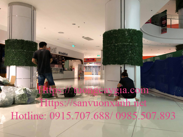 Trang trí toàn bộ trụ cột tòa nhà bằng các loại lá, hoa giả tại Siêu thị GiGa Mall, phường Hiệp Bình Chánh, quận Thủ Đức, Tp HCM