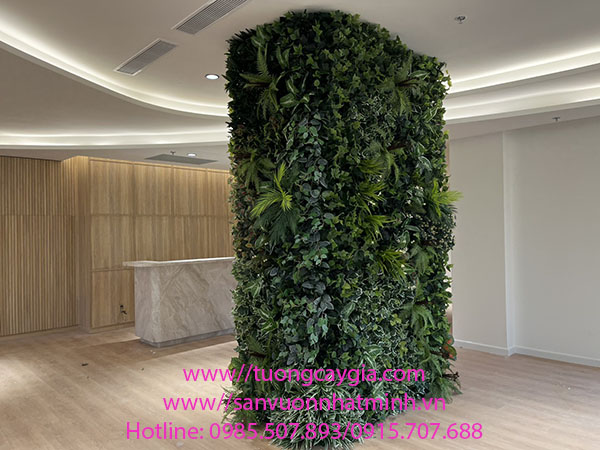 Vách tường cây mà chúng tôi thi công dưới đây là những chiếc trụ cột rất lớn của khối tòa nhà văn phòng. Cây xanh giả che khoảng cột trắng của tòa nhà hơn nữa cũng là tạo điểm nhấn không gian xanh thiên nhiên cho văn phòng Công ty.