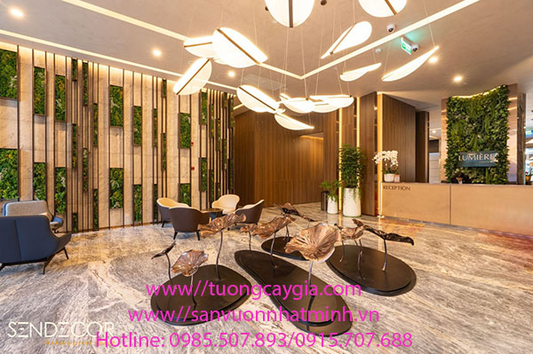 Đây là mảng tường cây lá dương xỉ chủ đạo, kết hợp với các tông lá màu xanh được lắp đặt khu chính giữa hai bên vách - khu Lễ tân tiếp đón khách hàng