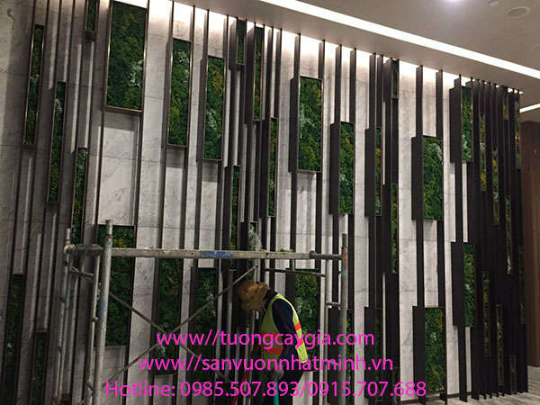 Các mảng rêu nhân tạo được gắn xen kẽ với khung gỗ nhìn rất tự nhiên, sang trọng