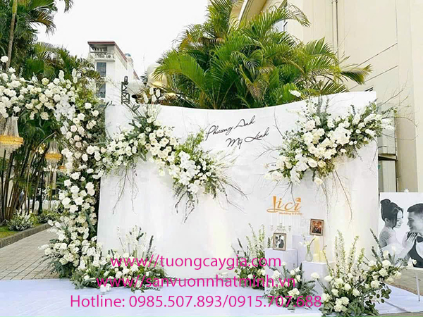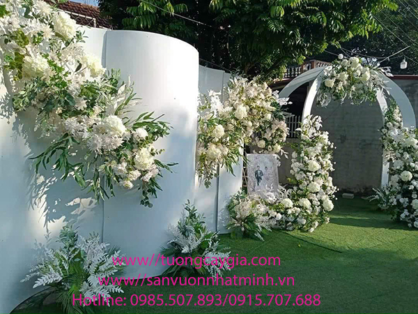 Thi công tường hoa cho tiệc cưới tại đường Xuân Thuỷ, Cầu Giấy, Hà Nội. Những bông hoa trắng xinh lung linh sắc màu.