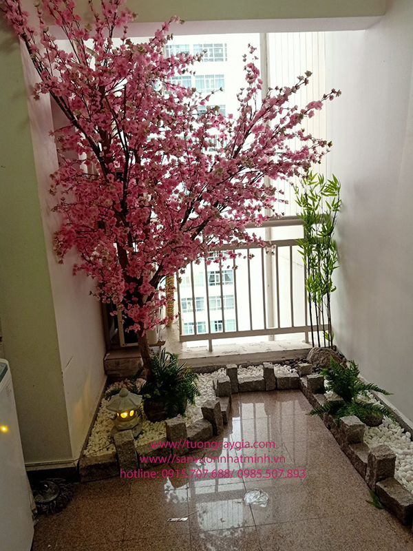 Tiểu cảnh ban công chung cư nhà anh Hùng tại chung cư Giai Việt - quận 8 là một ví dụ điển hình. Do anh Hùng bận rộn với công việc không có thời gian chăm sóc cây hoa lá nên anh đã lựa chọn hoa lá nhân tạo để thay thế. Đó là cây hoa anh đào nở quanh năm, một chút sỏi quậy, đèn vườn kiểu Nhật nhìn vừa đơn giản nhưng vẫn toát lên vẻ đẹp sáng trọng cho ban công xinh xắn này.