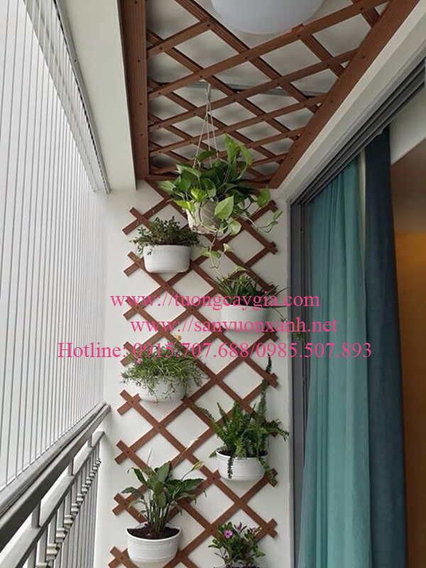 Ban công là một phần không thể thiếu của ngôi nhà, là nơi giúp các thành viên trong nhà luôn cảm thấy thoải mái khi hóng mát, ngắm những chậu hoa rực rỡ… giúp cân bằng cuộc sống bề bộn thường nhật. Tạo ra một góc vườn nhỏ nơi ban công là một ý tưởng không tồi và đã được nhiều gia đình áp dụng thực hiện đặc biệt với các căn hộ chung cư. Tuy nhiên nếu bạn không có nhiều thời gian chăm sóc chúng thì vẫn có một giải pháp đưa cây xanh đến gần bạn hơn, đó là giải pháp về tường cây giả. Tường cây giả với chất liệu cao cấp, chống bụi bẩn ẩm mốc và giống thật đến 99% này không chỉ khiến nhà bạn thêm đẹp mà còn có tác dụng làm thanh lọc không khí tạo cảm giác thoải mái thư giãn mỗi khi bạn về đến tổ ấm của mình. Hoặc trang trí bằng các thanh gỗ nhựa chịu được nước, ánh nắng,... với nhiều màu sắc nâu đậm, ghi, sữa,.. được thiết kế tinh tế như đan chéo cờ ca rô hoặc làm nan thẳng tạo sự sang trọng, treo vít các bình chậu cây hoa thật hoặc hoa lá giả.