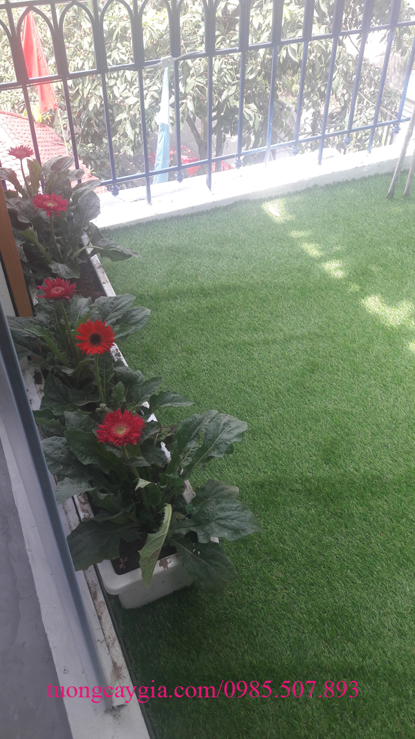 Tại sân thượng, hàng rào được bao quanh hộp gỗ xoan đào trồng cây dơn đỏ, thảm cỏ nhân tạo trải sàn xanh mướt, mềm mại