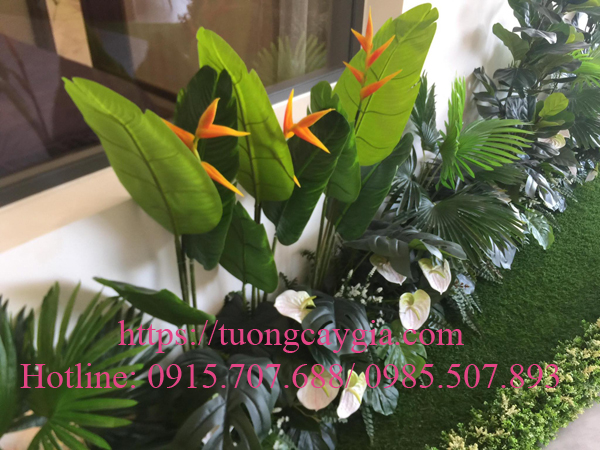 Hàng rào trồng thiên điểu kết hợp nền cỏ xanh, các cụm hoa lá dưới gốc cây