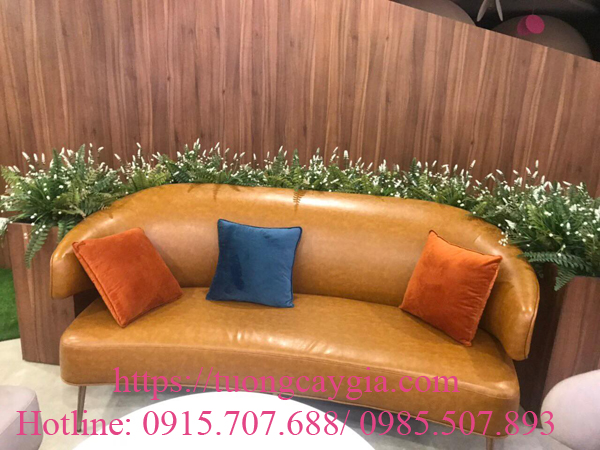 Cây hoa lá trồng trong bục gỗ đặt ngay sau ghế sofa