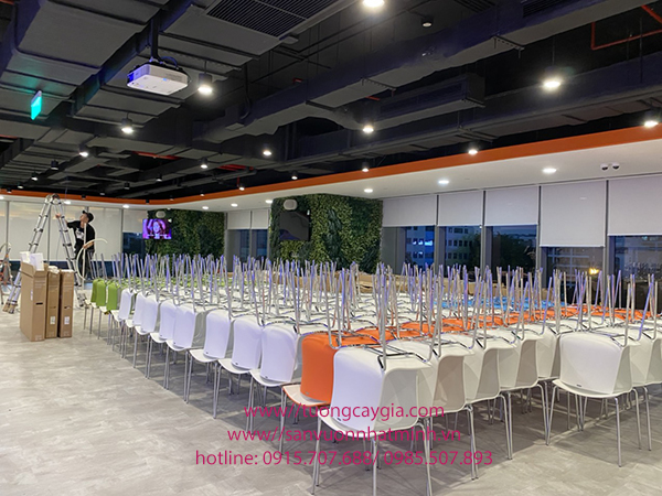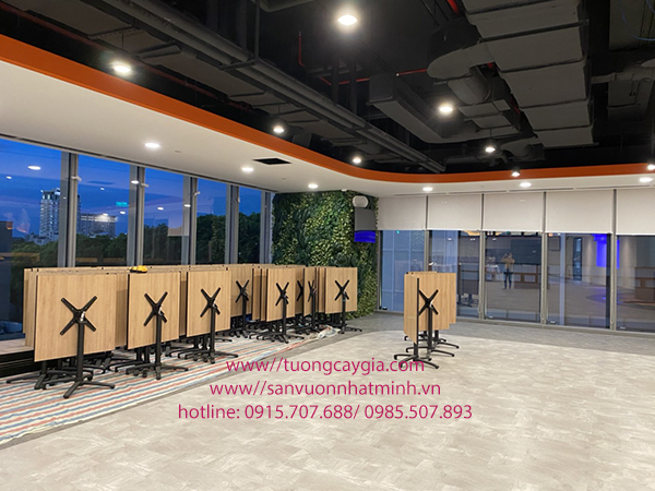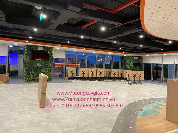 Nếu trước kia là những vách cột màu trắng đơn điệu thì nay phủ màu xanh của lá nhìn không gian trở nên đẹp hơn bao giờ hết. Sau 5 ngày miệt mài trang trí lắp đặt sản phẩm được chúng tôi ghi lại qua những tấm ảnh tuy thiếu ánh đèn vì công trình chưa hoàn tất nhưng vẫn toát lên được vẻ đẹp của không gian đội ngũ nhân viên Shopee làm việc nơi đây: