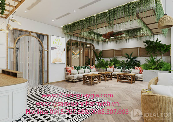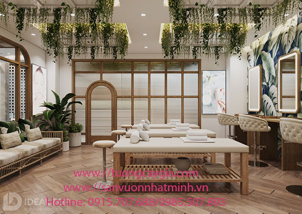 Dây rủ bám trần hoặc leo rủ xuống dưới được nhiều khách hàng lựa chọn để trang trí không gian cho trung tâm Spa, nhà hàng ăn, trung tâm giải trí,..