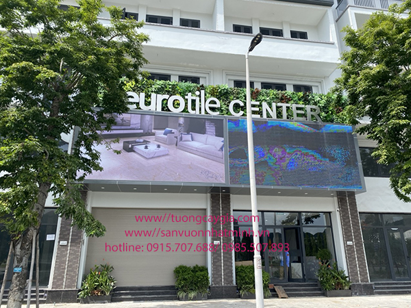 Mặt tiền showroom gắn màn hình led và phía trên có mảng cây lá kết hợp với logo