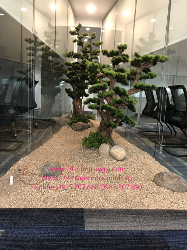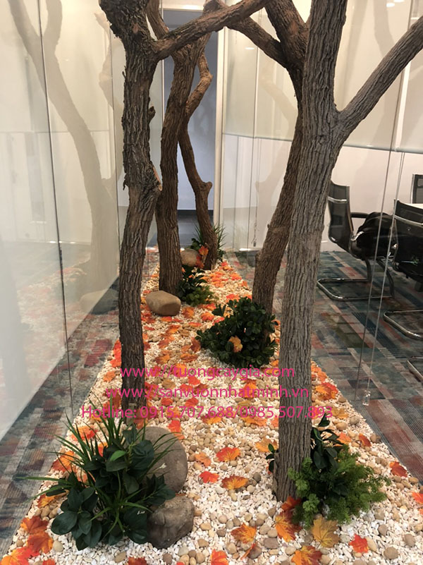 Tạo dáng cây và trang trí màu sắc theo phong cách mùa thu: Cây khô cổ thụ, lá phong rơi xen lẫn cỏ cây, sỏi cuội tự nhiên đến lạ thường. Mỗi tầng được bố trí 4 khu vực tiểu cảnh như trên, hai bên là vách kính trong suốt nhìn từ phòng họp