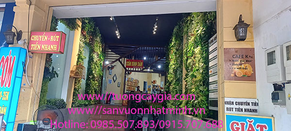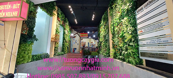 Khu trung tâm mua sắm và bán lẻ Vietmycosmetics số 88 Nguyễn Thái Sơn, phường 3, quận Gò Vấp, Tp Hồ Chí Minh, được trang trí các mảng tường cây lá xanh nhân tạo cho dọc tường hai bên lối vào trung tâm