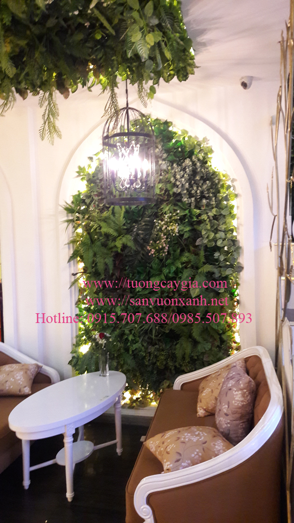 Phía trước sảnh kết hợp cây thật, cây giả bám tường