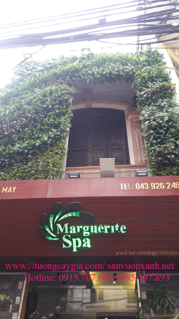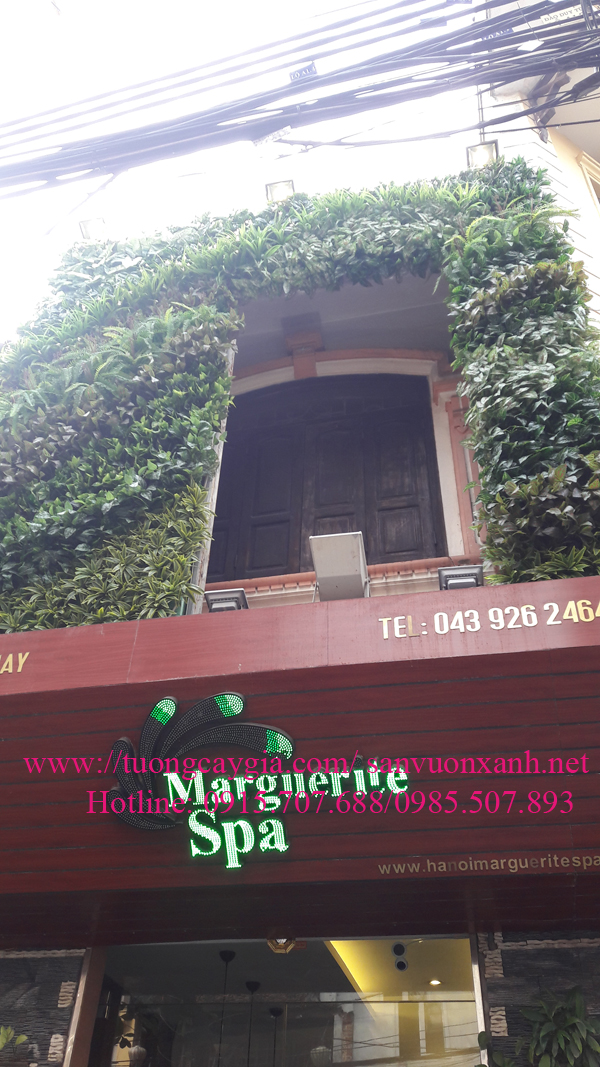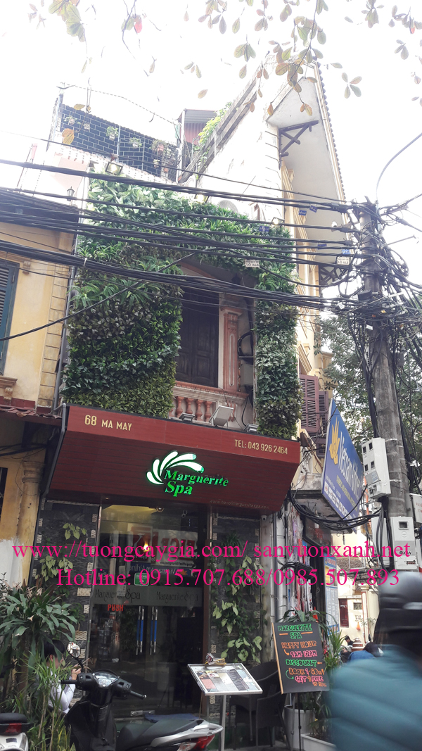 Vách tường cây giả mặt tiền nhà hàng Margurite Spa số 68 phố Mã Mây, Hoàn Kiếm, Hà Nội là một minh chứng:
