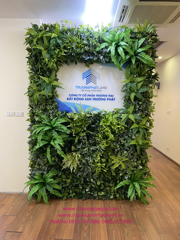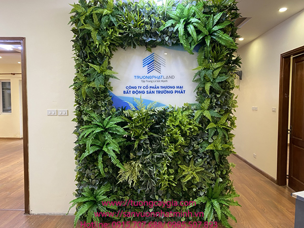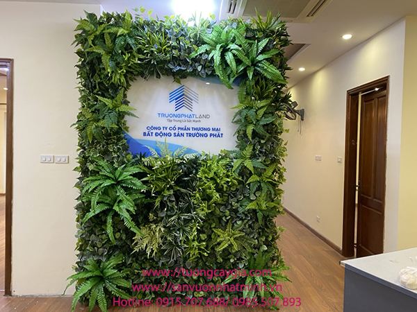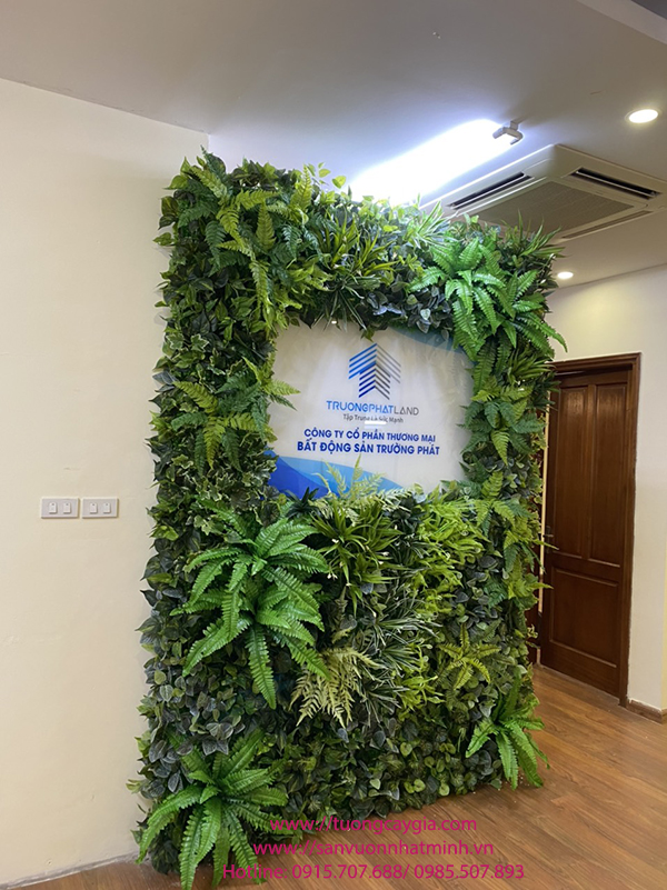 Một vách tường cây xanh giả nhỏ xinh gắn biển logo công ty BĐS Trường Phát tại tầng 11 số 1 Nguỵ Như Kom Tum