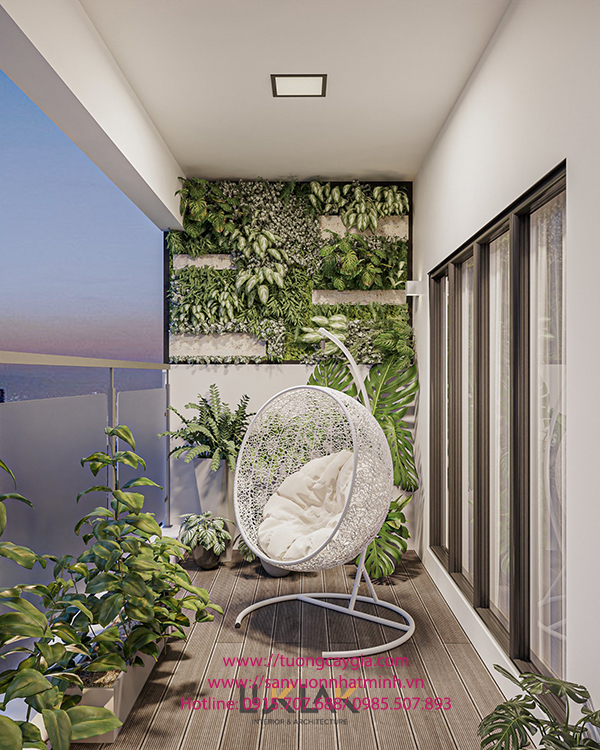 Thiết kế vách tường cây ban công hướng Tây nắng nóng quanh năm, cây xanh và kết hợp các đợt tấm gỗ nhựa compisite đầy tính nghệ thuật, các chậu cây xanh bên hông xanh tươi tốt