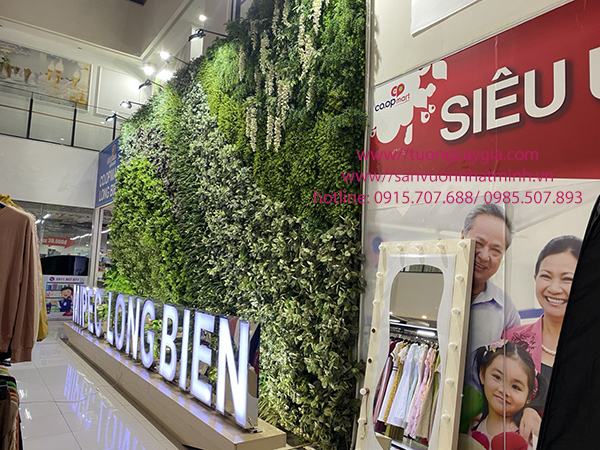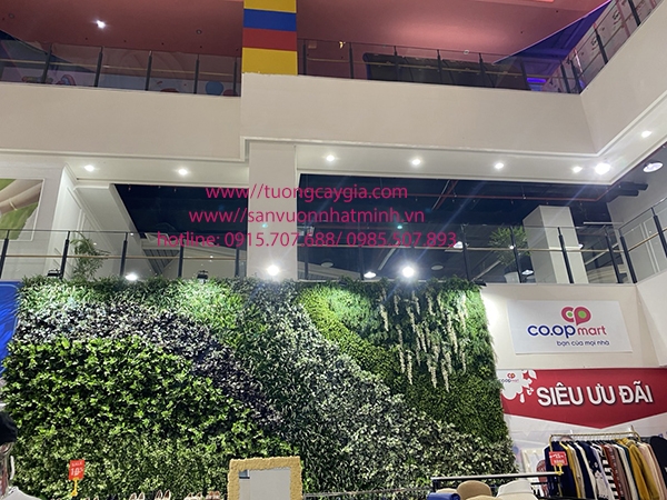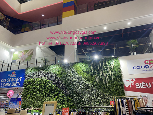 Lắp đặt vách tường cây xanh nhân tạo cho không gian sảnh siêu thị Co.opmart tại toà nhà Mipec Long Biên - Hà Nội với độ cao 7m. Chúng tôi đã tạo những đường nét cây giả uốn lượn nhịp nhàng không khô cứng mà cây lá trông như thật, phát triển tự nhiên xanh tươi tốt không kém gì cây thật ngoài nhà