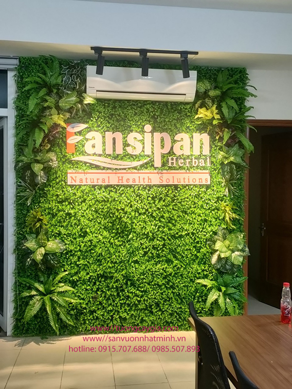 Nhật Minh chuyên trang trí, lắp đặt tường cỏ, tường cây, tường hoa nhân tạo với chất liệu cao su, lụa cao cấp chống bụi bẩn, cây hoa lá giống thật đến 99%. Dưới đây là mảng tường cỏ điểm vài cụm lá tạo điểm nhấn cho không gian văn phòng Fansipan - toà chung cư báo An ninh thủ đô - đường Nguyễn Xiển - Hoàng Mai - Hà Nội