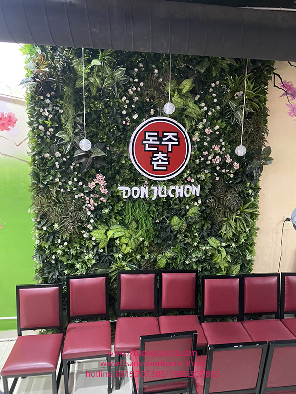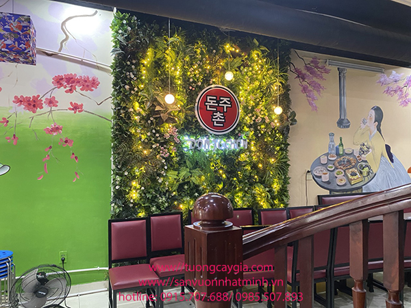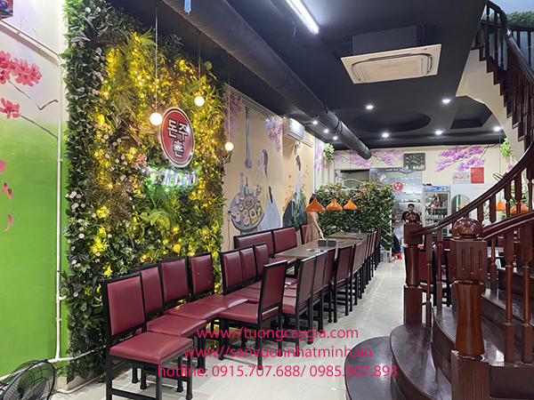 Decor vách tường cây lá xinh tươi tại nhà hàng nướng, lẩu phong cách Hàn Quốc tại số 50 Vũ Phạm Hàm, quận Cầu Giấy, Tp Hà Nội.